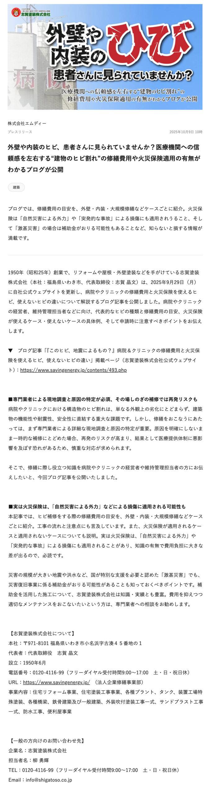 ▼ ブログ記事「『このヒビ、地震によるもの?』病院&クリニックの修繕費用と火災保険を使えるヒビ、使えないヒビの違い」掲載ページ(志賀塗装株式会社公式ウェブサイト):https://www.savingenergy.jp/contents/493.php