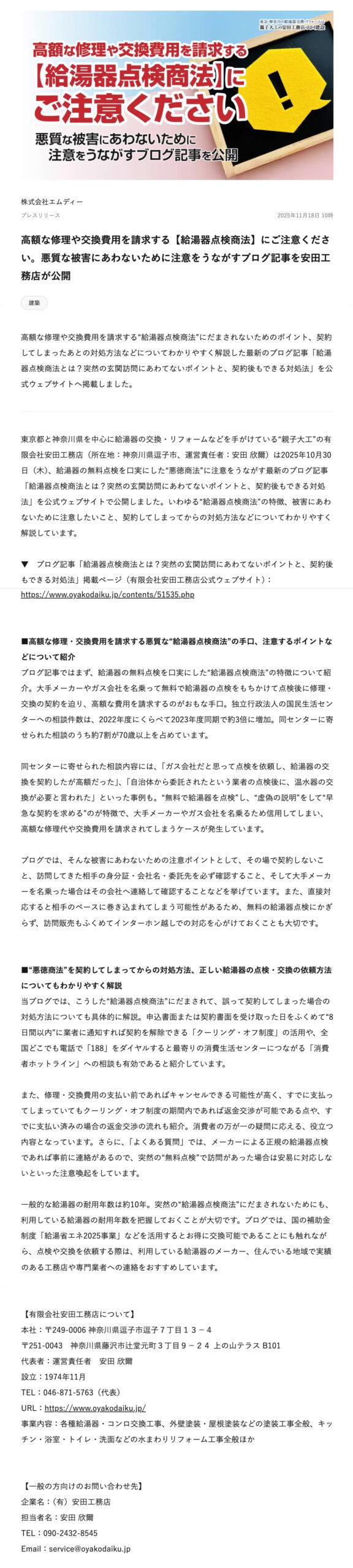 東京都・神奈川県を中心にリフォームや給湯器交換を行う「親子大工」の有限会社安田工務店は、高額な修理・交換費用を請求する「給湯器点検商法」への注意を呼びかける最新ブログ記事を公開しました。