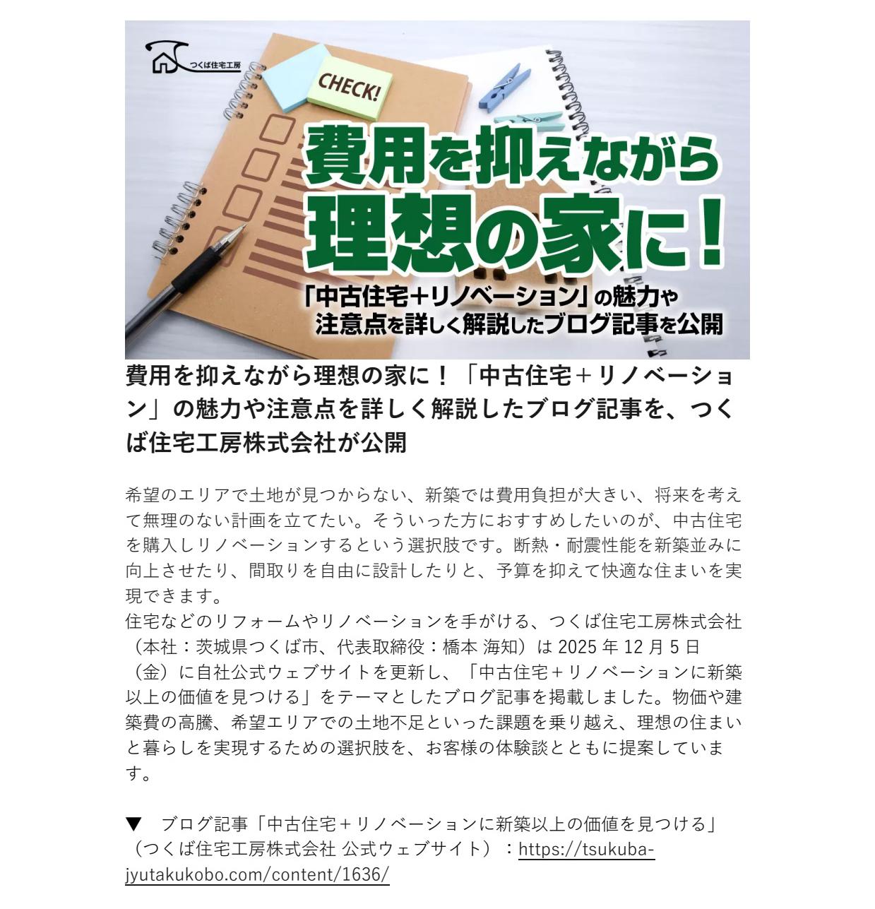 住宅リフォーム・リノベーションを手がけるつくば住宅工房株式会社は、2025年12月5日(金)に公式サイトを更新。物価や建築費の上昇、土地不足といった課題に向き合いながら、実際の体験談を交えて理想の暮らしを叶えるヒントを紹介しています。