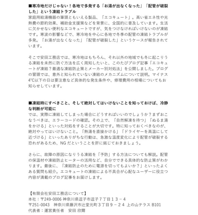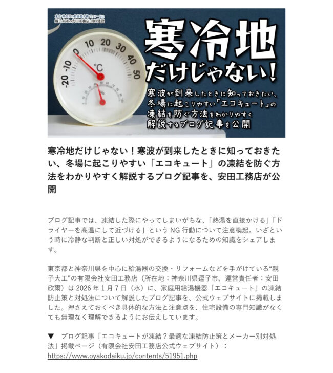 ▼ ブログ記事「エコキュートが凍結?最適な凍結防止策とメーカー別対処法」掲載ページ(有限会社安田工務店公式ウェブサイト):https://www.oyakodaiku.jp/contents/51951.php